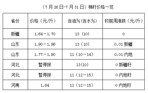 上周,內(nèi)地棉籽供應(yīng)量較少,油棉廠開工仍以新疆棉籽為主,時至7月下旬,多數(shù)持籽商積極出貨,但因成本難下,維持高位運行,個別小幅調(diào)整。受棉籽原料供應(yīng)不足和天氣炎熱制約,內(nèi)地油棉廠開工率不足50%,部分油棉廠堅持收購加工,棉副產(chǎn)品持價運行,但因下游高位成交觀望,成交量一般,油棉廠經(jīng)營難以活躍。離新棉籽上市時間較久,未來棉籽處青黃不接階段,高位運行之勢仍將持續(xù)。