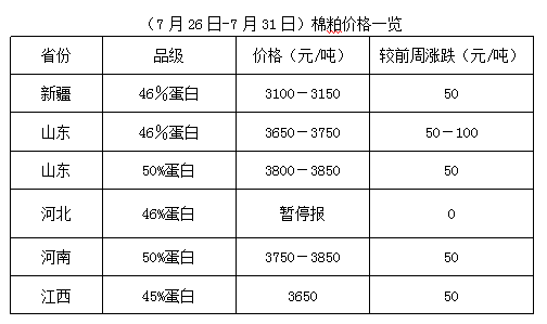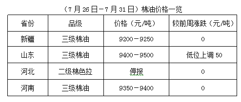 上周(7月26-31日),大豆期貨及豆類產(chǎn)品震蕩調(diào)整,棉油、棉粕現(xiàn)貨行情難以穩(wěn)定。因棉籽原料資源匱乏,棉籽整體供應(yīng)量不足,難以滿足油棉廠正常開工,部分油棉廠堅持收購加工,棉副產(chǎn)品因貨少持價難下,但因下游廠家高位采購謹(jǐn)慎,成交少量,油棉廠經(jīng)營相對冷清。