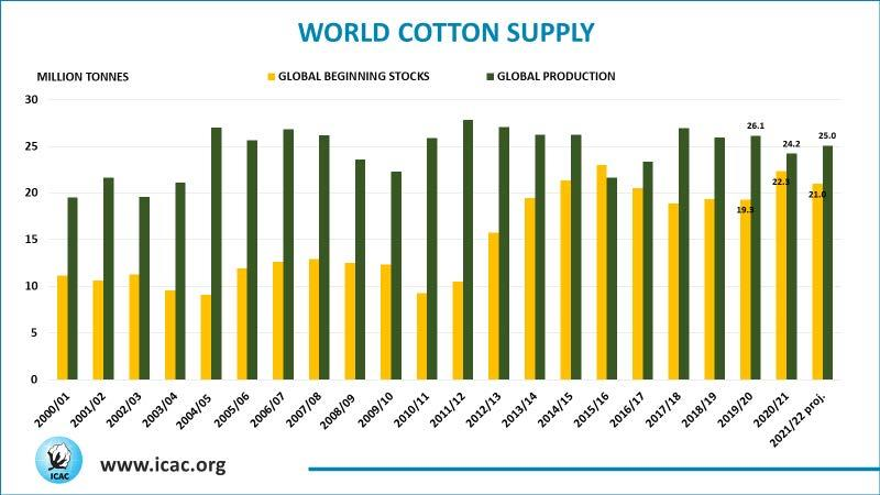 新冠病毒在2021/21年度拖累全球棉花產(chǎn)量降至2420萬噸,較上年度下滑7%。