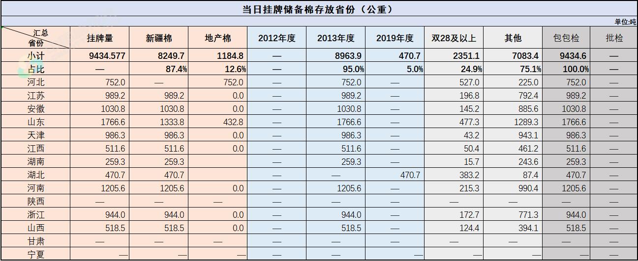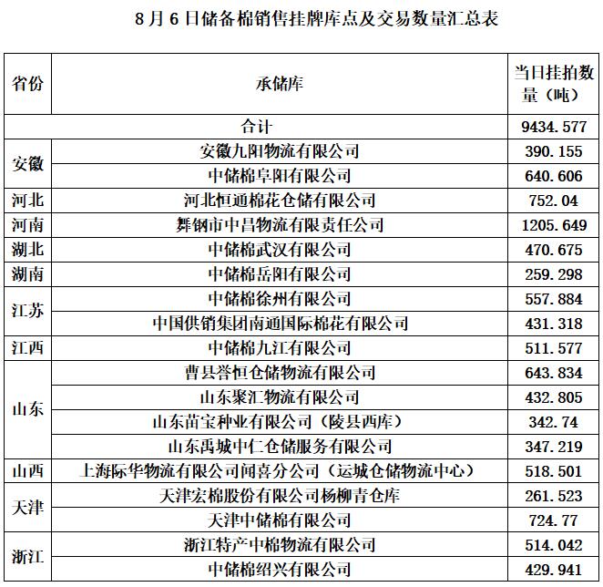 中國(guó)儲(chǔ)備棉管理有限公司定于8月6日上市銷售儲(chǔ)備棉重量9434.577噸,共41捆,其中新疆棉8249.73噸。