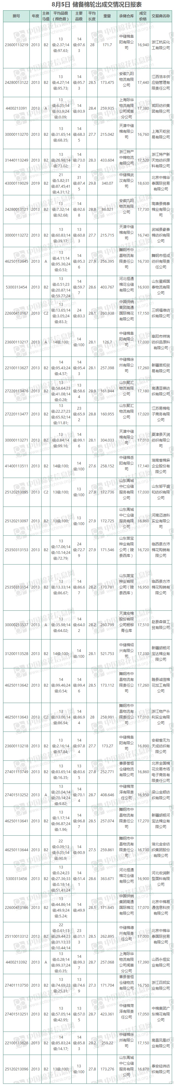 8月5日儲備棉輪出銷售資源9422.75噸,實(shí)際成交9422.75噸,成交率100%,成交均價(jià)17133元/噸,較4日下跌83元/噸,折3128價(jià)格18359元/噸,較4日下跌102元/噸。