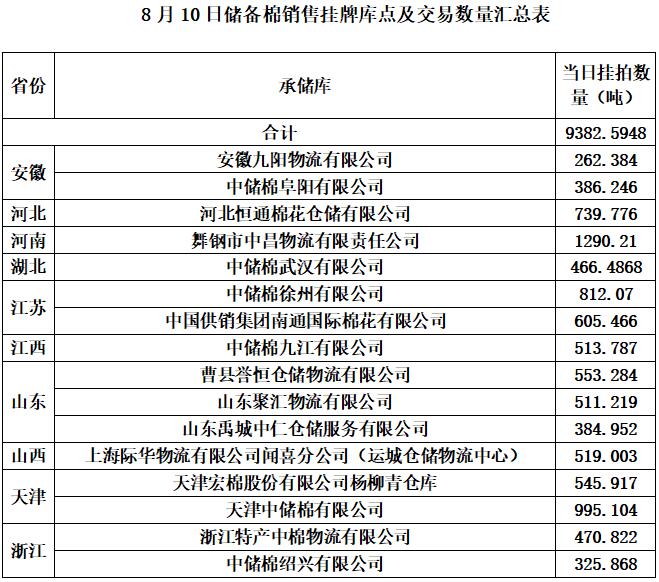 中國儲備棉管理有限公司定于8月10日上市銷售儲備棉重量9382.5948噸,共41捆,其中新疆棉6083.55噸。