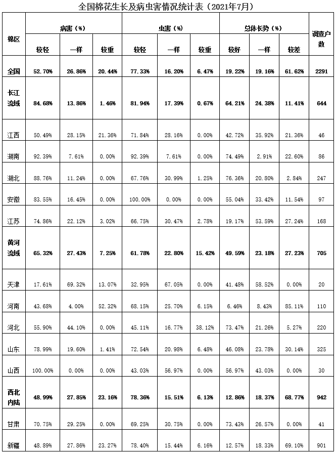 2021年7月中國(guó)棉花協(xié)會(huì)棉農(nóng)分會(huì)對(duì)全國(guó)12個(gè)省市和新疆自治區(qū)2291個(gè)定點(diǎn)農(nóng)戶進(jìn)行棉花生長(zhǎng)情況及預(yù)計(jì)產(chǎn)量調(diào)查。調(diào)查結(jié)果顯示:全國(guó)植棉面積為4345.59萬(wàn)畝,同比減少5.47%;預(yù)計(jì)全國(guó)棉花總產(chǎn)量約為576.31萬(wàn)噸,同比減少2.71%,減幅較上期縮小0.7個(gè)百分點(diǎn)。分區(qū)域看,新疆地區(qū)棉花長(zhǎng)勢(shì)仍差于去年,但病蟲害輕于上月,預(yù)計(jì)單產(chǎn)降幅較上期有所收窄;7月黃河流域大部分地區(qū)前期干旱,月末遭遇強(qiáng)降雨,部分棉花出現(xiàn)倒伏,嚴(yán)重地區(qū)出現(xiàn)絕收;長(zhǎng)江流域大部棉區(qū)氣候平穩(wěn)正常,棉花總體長(zhǎng)勢(shì)較好。