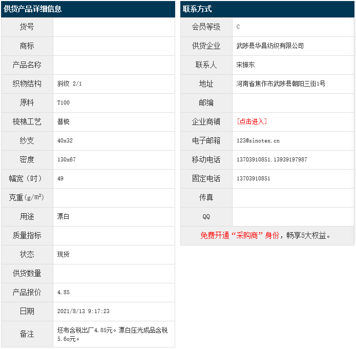 8月13日,武陟縣華昌紡織有限公司純滌斜紋布T100 40x32 130x67 49" 2/1,報價為4.85元/米,實際成交價以協(xié)商為準(zhǔn)。[點擊查看詳情]
