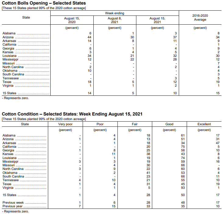 美國(guó)農(nóng)業(yè)部8月16日發(fā)布的美國(guó)棉花生長(zhǎng)報(bào)告顯示,截至8月15日當(dāng)周,美棉現(xiàn)蕾率為93%,前周為88%,去年同期為99%,五年均值為99%。美棉結(jié)鈴率為75%,前周為63%,去年同期為79%,五年均值為82%。美棉吐絮率為10%,前周為5%,去年同期為14%,五年均值為15%。美棉生長(zhǎng)優(yōu)良率為67%,前周為65%,去年同期為45%。