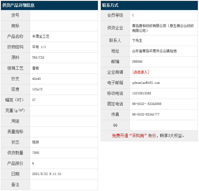 8月23日,青島君和紡織有限公司(原五棉云山紡織有限公司)半漂全工藝滌棉平布T65/C35 45x45 133x72 57" 1/1,報(bào)價(jià)為6元/米,實(shí)際成交價(jià)以協(xié)商為準(zhǔn)。[點(diǎn)擊查看詳情]