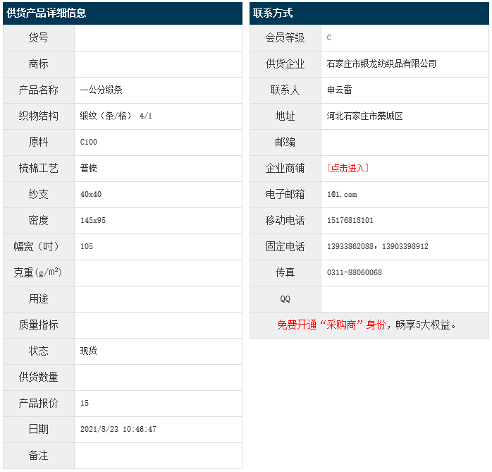 8月23日,石家莊銀龍紡織品有限公司純棉1公分緞條C100 40x40 145x95 105",報價為15元/米,實際成交價以協(xié)商為準。[點擊查看詳情]