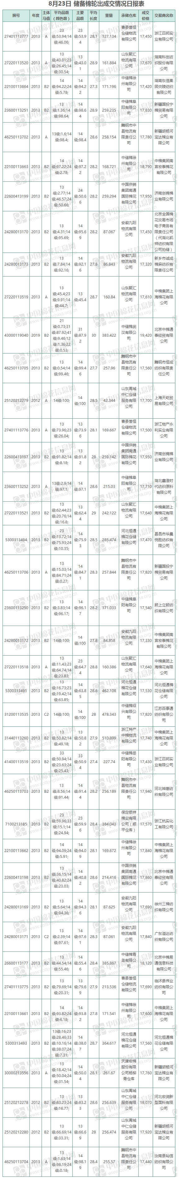 8月23日儲備棉輪出銷售資源9313.66噸,實際成交9313.66噸,成交率100%,成交均價17797元/噸,較20日上漲208元/噸,折3128價格18971元/噸,較20日上漲152元/噸?!?/p>