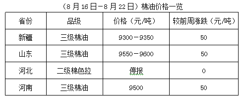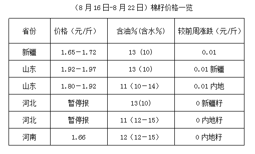 上周(8月16-22日),各地新花出現(xiàn)零星裂鈴吐絮,但離新棉集中上市仍需一段時間。當前,豆油、豆粕期貨高位震蕩難穩(wěn),棉油、棉粕易漲難跌,加之棉籽處青黃不接階段,資源更顯不足,棉籽價格高位有漲,油棉廠對棉副產(chǎn)品更是挺價出貨,但因目前棉副產(chǎn)品多處高位,且棉油、棉粕與豆油、豆粕價格倒掛明顯,下游需求面跟進緩慢,市場高位成交少量。新棉籽集中上市前,棉籽、棉副易漲難跌之勢暫難改變。