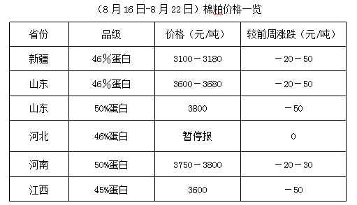 元/噸,較前周五收盤價3662元/噸下調(diào)60元/噸,現(xiàn)貨價格有跌。周末沿海地區(qū)43%蛋白豆粕價至3560-3670元/噸,較前周下跌30-50元/噸。豆粕價格下跌,棉粕先漲后跌。因棉籽價格高位有漲,油棉廠斷續(xù)開工,棉粕產(chǎn)出量有限,廠家多持價出貨。但因棉粕與豆粕價格倒掛,下游采購謹慎,需求少量,限制棉粕上漲空間,個別廠家成交可議,價格有所下調(diào)。新棉籽上市前,棉粕在參照豆粕行情走勢下,保持相對持價之勢運行。