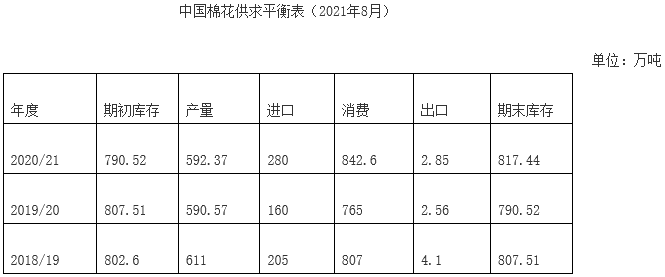7月,我國實(shí)施強(qiáng)有力的疫情防控措施,生產(chǎn)經(jīng)營活動進(jìn)一步恢復(fù),紡織生產(chǎn)銷售持續(xù)穩(wěn)中向好,企業(yè)訂單充足,開工率維持較高水平,成品銷售順暢,紗線利潤較高,為近10年所罕見,棉花需求持續(xù)旺盛,未有減速跡象。從供給端看,據(jù)中國棉花協(xié)會調(diào)查,2021年度全國棉花預(yù)計(jì)總產(chǎn)量約為576.31萬噸,同比減少2.71%;7月國儲棉輪出約19.11萬噸,成交率達(dá)100%。國內(nèi)外棉價大幅上漲,國內(nèi)期、現(xiàn)貨價格已達(dá)到2015年以來最高點(diǎn),國際棉價創(chuàng)下2013年以來新高。中國棉花協(xié)會預(yù)計(jì),2020/21年度棉花消費(fèi)量為842.6萬噸,同比增長11.33%,較上期調(diào)增32.6萬噸;進(jìn)口量為280萬噸,同比增長75%,較上期調(diào)減20萬噸,出口量為2.85萬噸,同比增長11.33%,較上期調(diào)減0.15萬噸;期末庫存相應(yīng)調(diào)整為817.44萬噸,同比增長3.41%,較上期調(diào)減49.85萬噸;產(chǎn)量為592萬噸,同比持平略增。
