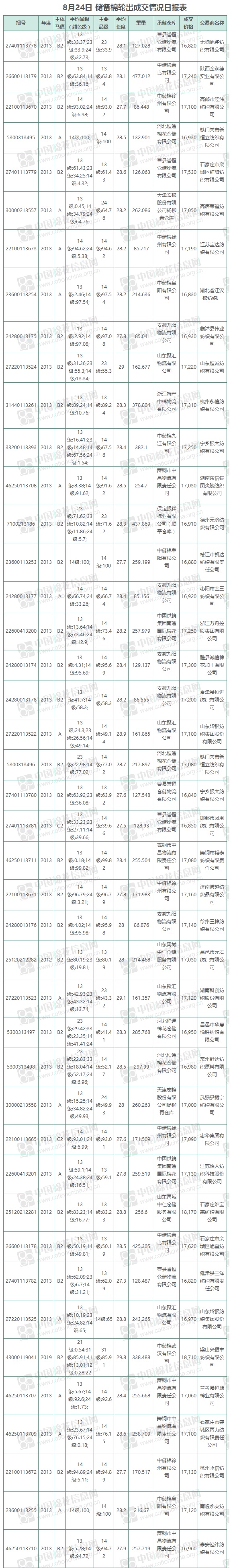 8月24日儲(chǔ)備棉輪出銷售資源9384.01噸,實(shí)際成交9384.01噸,成交率100%,成交均價(jià)17186元/噸,較23日下跌611元/噸,折3128價(jià)格18389元/噸,較23日下跌582元/噸?!?/p>