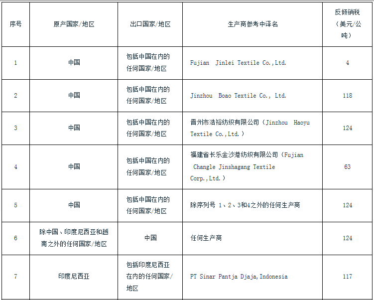 2021年8月19日,印度商工部發(fā)布公告稱,對(duì)原產(chǎn)于或進(jìn)口自中國(guó)、印尼、越南的滌綸紗線(或滌綸短纖紗線)[PolyesterYarn(PolyesterSpunYarn)]作出反傾銷(xiāo)肯定性終裁,建議對(duì)上述國(guó)家的涉案產(chǎn)品征收為期5年的反傾銷(xiāo)稅,其中中國(guó)涉案產(chǎn)品稅額為4-124美元/公噸,印尼涉案產(chǎn)品稅額為65-191美元/公噸,越南涉案產(chǎn)品稅額為281美元/公噸,詳細(xì)稅額見(jiàn)附表(印度對(duì)涉華滌綸紗線反傾銷(xiāo)終裁建議征稅表);同時(shí)對(duì)尼泊爾涉案產(chǎn)品作出反傾銷(xiāo)否定性終裁。涉案產(chǎn)品不包括染色滌綸紗、混色滌綸紗或彩色滌綸紗及紗線支數(shù)粗于8支(8scounts)或細(xì)于45支(45scounts)的滌綸紗。本案涉及印度海關(guān)編碼55092100項(xiàng)下的產(chǎn)品。