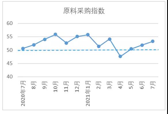 7月,原料采購指數(shù)53.25,較6月上升1.39。從價格看,當(dāng)月棉價大幅上漲,國內(nèi)棉價漲幅高于國際棉價,CotlookA指數(shù)月平均值97.70美分/磅,環(huán)比上漲3.2美分/磅,漲幅3.39%;3128級棉花月均價17187元/噸,環(huán)比上漲932元/噸,漲幅5.73%?;w短纖價格平均漲幅略低于棉價,主流粘膠纖維月均價12842元/噸,環(huán)比上漲75元/噸,漲幅0.59%;1.4D直紡滌綸短纖月均價7145元/噸,環(huán)比上漲298元/噸,漲幅4.35%。從棉紡織企業(yè)采購看,棉花采購量指數(shù)48.77,非棉纖維采購量指數(shù)52.14,非棉纖維采購情況好于棉花。整體看,原料采購指數(shù)上升主要受原料價格拉動。