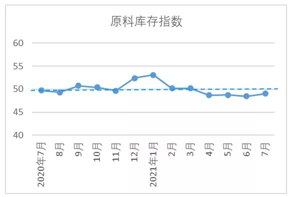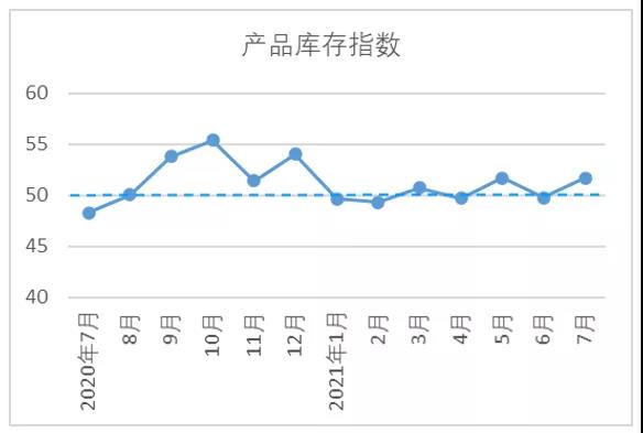 7月,原料庫存指數(shù)49.03,處于欠景氣狀態(tài)。主要有兩方面原因:第一,原料采購量減少;第二,企業(yè)生產(chǎn)增加,原料消耗加快。具體看,棉花庫存量指數(shù)48.91,非棉纖維庫存量指數(shù)49.15,可以看出非棉纖維庫存略好于棉花。據(jù)中國棉紡織行業(yè)協(xié)會(以下簡稱“中棉行協(xié)”)調(diào)查數(shù)據(jù),7月,棉花庫存量環(huán)比下降企業(yè)占比為42.90%,高于上升企業(yè)占比10.88個百分點;非棉纖維庫存量環(huán)比下降的企業(yè)占比為38.73%,高于上升企業(yè)占比8.51個百分點。