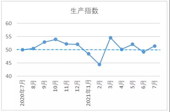 7月,生產(chǎn)指數(shù)51.42,較6月指數(shù)上升2.27。根據(jù)調(diào)研了解,當(dāng)月棉紡織企業(yè)開機良好,開機率和產(chǎn)量均有所增加。其中,紗產(chǎn)量指數(shù)51.66,布產(chǎn)量指數(shù)52.25,開機率指數(shù)50.93。調(diào)查數(shù)據(jù)顯示,當(dāng)月紗產(chǎn)量環(huán)比上升企業(yè)占比為44.94%,高于下降企業(yè)占比16.58個百分點,布產(chǎn)量環(huán)比上升企業(yè)占比為49.60%,高于下降企業(yè)占比22.53個百分點,開機率上升企業(yè)占比為17.45%,高于下降企業(yè)占比9.32個百分點。