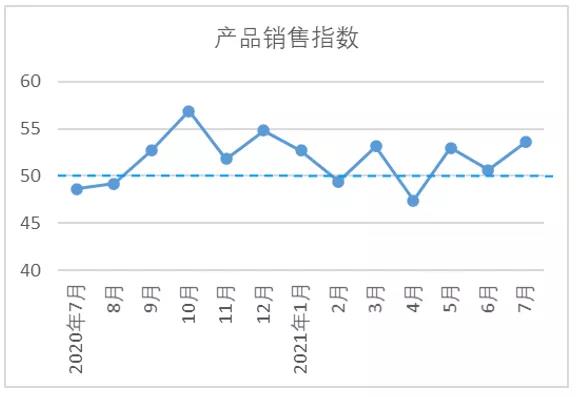 7月,產(chǎn)品銷售指數(shù)53.57,較6月指數(shù)上升2.95。從價格看,當(dāng)月棉紗價格在原料價格上漲拉動下大幅上漲,坯布價格略顯滯后,漲幅低于棉價。具體看,32支純棉普梳紗月均價25960元/噸,環(huán)比上漲710元/噸,漲幅2.81%,純棉坯布(32*32130*702/147"斜紋)月均價6.04元/噸,環(huán)比上漲0.06元/米,漲幅1%。從銷量看,紗布銷售均好于6月。調(diào)查數(shù)據(jù)顯示,紗銷售量環(huán)比上升企業(yè)占比為49.48%,高于下降企業(yè)占比19.33個百分點,布銷售量上企業(yè)占比為53.04%,高于下降企業(yè)占比22.84個百分點。產(chǎn)品銷售指數(shù)的上升受價格和銷量雙重拉動。