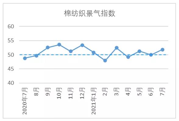 說明:中國棉紡織行業(yè)景氣指數(shù)采集自全國近500家次棉紡織企業(yè),參考國家制造業(yè)PMI等指數(shù)制定方式,通過對多個主要指標加權(quán)計算得出,當(dāng)指數(shù)高于50,表示棉紡織行業(yè)本月景氣程度好于上月,低于50則表示本月景氣程度不及上月。