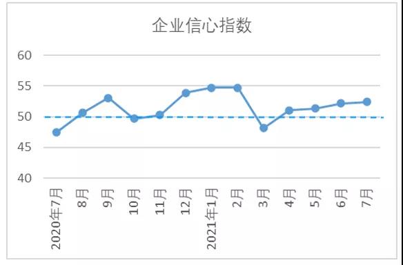 7月,企業(yè)信心指數(shù)52.39,較6月指數(shù)上升0.19。當(dāng)前全球疫情仍在持續(xù)演變,外部環(huán)境依然復(fù)雜嚴峻。企業(yè)表示受疫情影響,歐美“雙節(jié)”訂單提前下達,東南亞疫情形勢嚴峻,部分外貿(mào)訂單回流至國內(nèi)。國內(nèi)方面,棉價大漲,儲備棉成交火爆,淡季不淡,明顯好于往年。即將進入傳統(tǒng)紡織旺季,下游企業(yè)陸續(xù)開始為“金九銀十”備貨,新一輪訂單即將開啟,企業(yè)對于后期充滿信心。調(diào)查數(shù)據(jù)顯示,認為后市樂觀向好企業(yè)占比為38.95%,認為后市弱勢下行企業(yè)占比為15.09%。