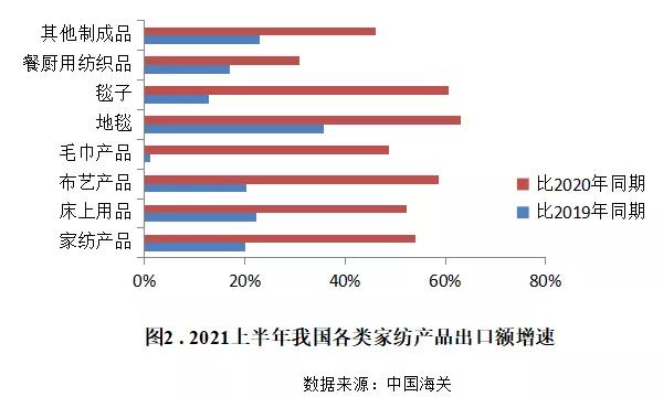 從出口產(chǎn)品情況看,今年上半年地毯、床上用品、毯子和布藝產(chǎn)品出口表現(xiàn)較為突出,出口額較2019年同期均實(shí)現(xiàn)超過20%的增長幅度。