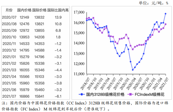(一)國(guó)內(nèi)棉價(jià)連續(xù)3個(gè)月上漲。7月,東南亞疫情升級(jí)導(dǎo)致部分訂單回流國(guó)內(nèi),紡織企業(yè)棉花采購(gòu)需求增加,帶動(dòng)棉價(jià)持續(xù)上漲。7月,國(guó)內(nèi)3128B級(jí)棉花月均價(jià)每噸16866元,環(huán)比漲5.6%,同比漲38.8%。鄭棉期貨主力合約(CF109)月結(jié)算價(jià)每噸16679元,環(huán)比漲5.8%,同比漲38.9%。