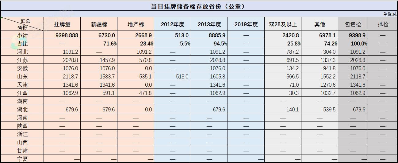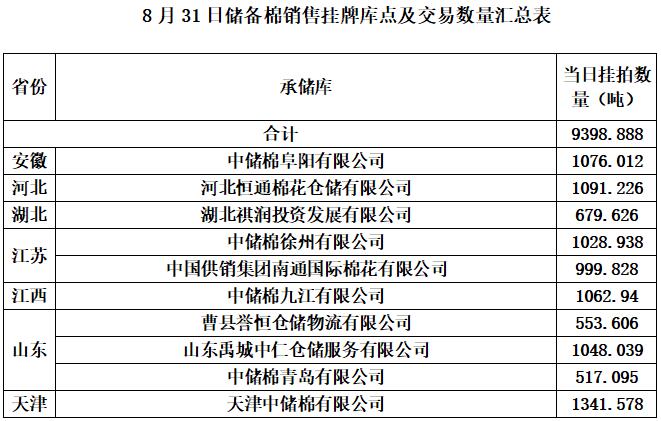 中國(guó)儲(chǔ)備棉管理有限公司定于8月31日上市銷(xiāo)售儲(chǔ)備棉重量9398.888噸,共45捆,其中新疆棉6729.97噸。