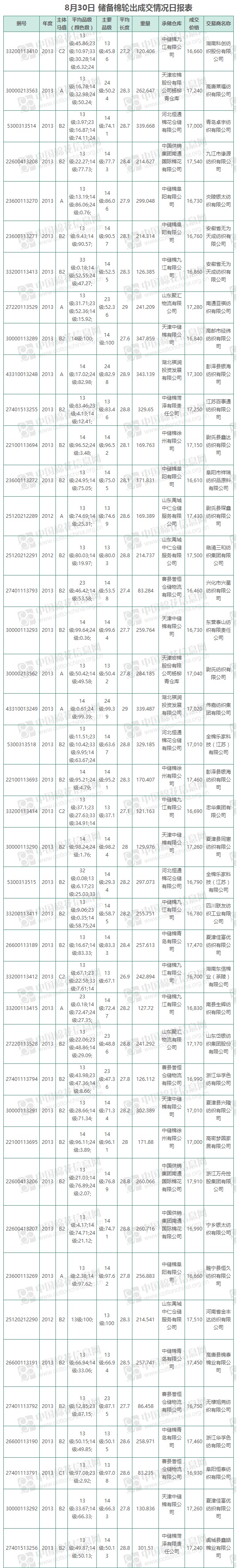 8月30日儲(chǔ)備棉輪出銷售資源9415.80噸,實(shí)際成交9415.80噸,成交率100%,成交均價(jià)17088元/噸,較27日上漲69元/噸,折3128價(jià)格18395元/噸,較27日下跌82元/噸。