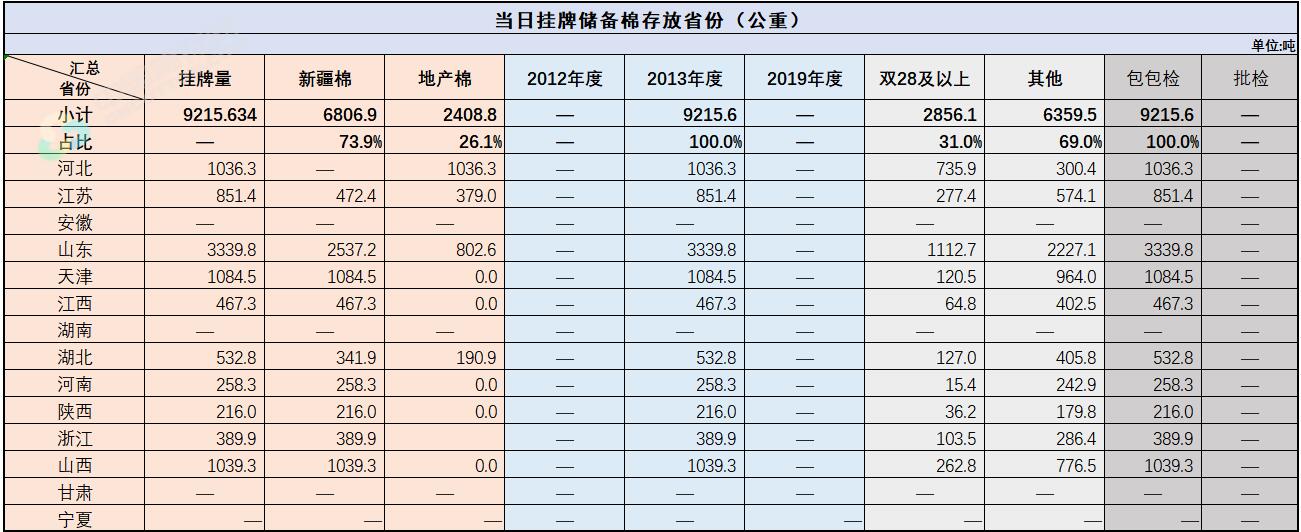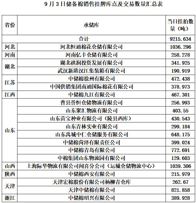 中國(guó)儲(chǔ)備棉管理有限公司定于9月3日上市銷售儲(chǔ)備棉重量9215.634噸,共39捆,其中新疆棉6806.87噸。
