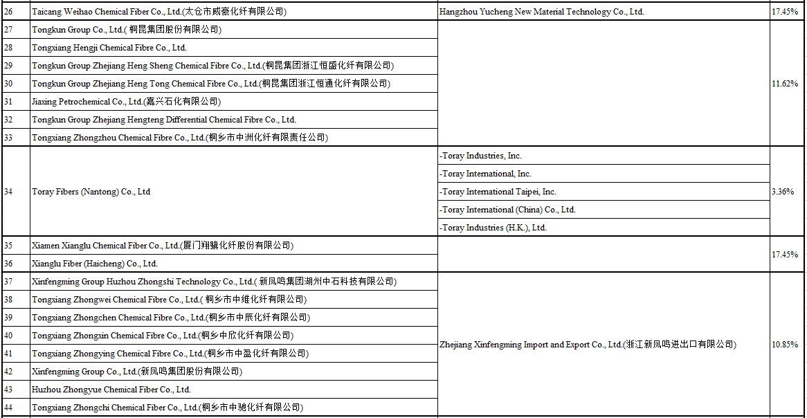 2021年9月1日,越南工貿(mào)部發(fā)布第2080/QD-BCT號(hào)決議,對(duì)進(jìn)口自中國(guó)、印度、印尼、馬來(lái)西亞的聚酯長(zhǎng)絲紗線作出反傾銷(xiāo)肯定性初裁,初步裁定對(duì)涉案產(chǎn)品征收臨時(shí)反傾銷(xiāo)稅,其中中國(guó)涉案產(chǎn)品的稅率為3.36-17.45%(詳見(jiàn)下表)、印度為54.90%、印尼為21.94%、馬來(lái)西亞為21.23%。涉案產(chǎn)品的越南稅號(hào)為5402.33.00、5402.46.00、5402.47.00。本案傾銷(xiāo)調(diào)查期為2019年全年,損害調(diào)查期為2017年至2019年。措施自公告發(fā)布3日起生效,有效期不超過(guò)120天。
