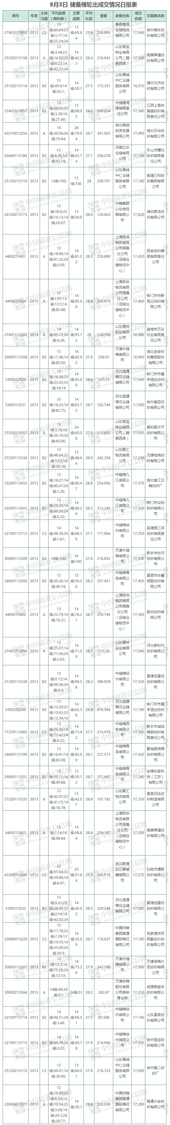 9月3日儲備棉輪出銷售資源9215.63噸,實際成交9215.63噸,成交率100%,成交均價17276元/噸,較2日上漲235元/噸,折3128價格18602元/噸,較2日上漲243元/噸。