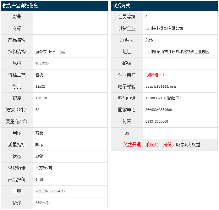 9月6日,四川玉揚(yáng)紡織有限公司滌棉魚骨紋T65/C35 32x32 130x70 63" 噴氣 毛邊,報價為6.15元/米,實際成交價以協(xié)商為準(zhǔn)。[點擊查看詳情]