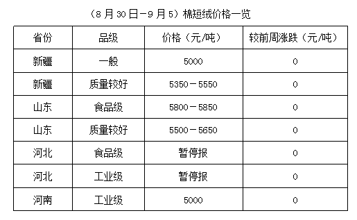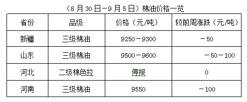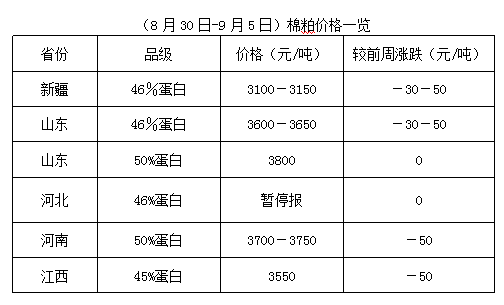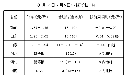 上周(8月30日-9月5日),各地新花零星上市,但因質(zhì)量參差,數(shù)量較少,集中上市仍需時日。各地棉籽成交仍以庫存陳棉籽為主,因供應(yīng)量有限,棉籽價格居高,存籽商積極出貨,價格有所波動。因油棉廠收購少量,棉副產(chǎn)品貨少持價,個別開工廠家順價出貨,價格波動難穩(wěn),整體報價略顯混亂,成交少量。