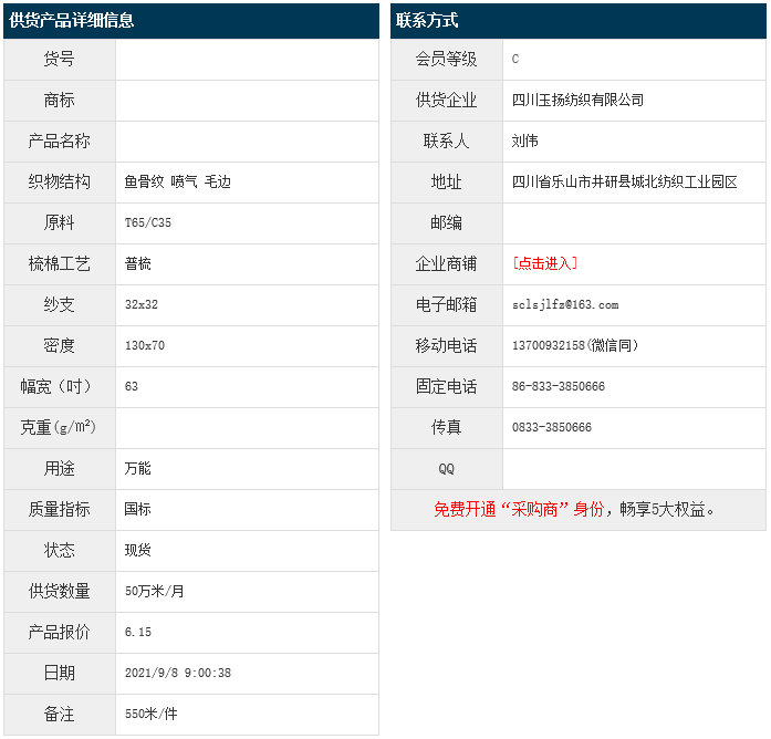 9月8日,四川玉揚紡織有限公司滌棉魚骨紋T65/C35 32x32 130x70 63" 噴氣 毛邊,報價為6.15元/米,實際成交價以協(xié)商為準。[點擊查看詳情]
