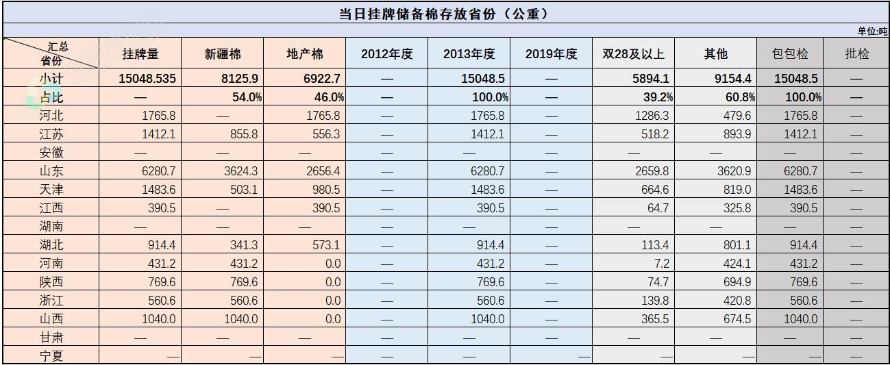 中國(guó)儲(chǔ)備棉管理有限公司定于9月9日通過(guò)全國(guó)棉花交易市場(chǎng)上市銷售中央儲(chǔ)備棉重量15048.535噸,共69捆,其中新疆棉8125.9噸。