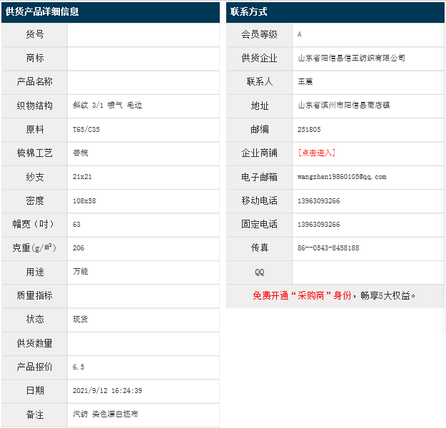 9月12日,山東陽信縣信王紡織有限公司滌棉斜紋OET65/C35 21x21 108x58 63" 3/1 噴氣 毛邊,報價為6.5元/米,實際成交價以協(xié)商為準。[點擊查看詳情]