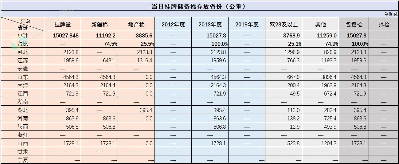中國(guó)儲(chǔ)備棉管理有限公司定于9月14日通過全國(guó)棉花交易市場(chǎng)上市銷售中央儲(chǔ)備棉重量15027.848噸,共65捆,其中新疆棉11192.2噸。