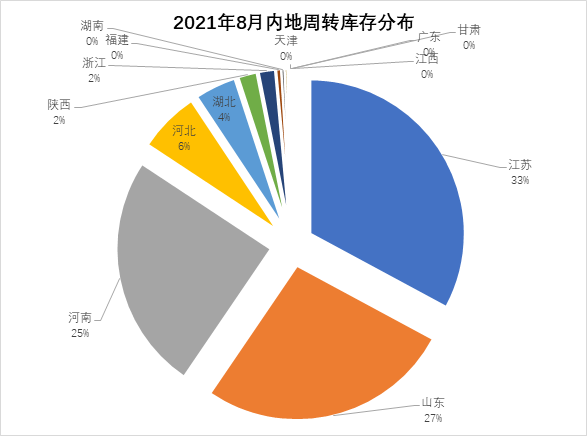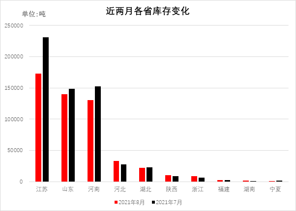 分省份看,江蘇省庫存量居首位為17.27萬噸,山東省次之為14萬噸,河南省居第三位為13.03萬噸,河北省為3.35萬噸,湖北省為2.25萬噸,陜西省1萬噸,其他省均在1萬噸以下。