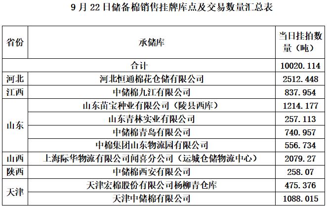 中國儲備棉管理有限公司定于9月22日通過全國棉花交易市場上市銷售中央儲備棉重量10020.114噸,共41捆,其中新疆棉6258.1噸。