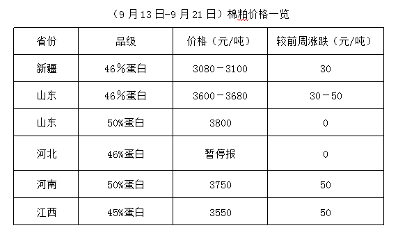 上周,豆粕期貨震蕩運(yùn)行,周五呈反彈之勢(shì),但因中秋節(jié)周一外盤回落,現(xiàn)貨豆粕滯漲回落。大連盤2201主力合約周五收盤價(jià)至3570元/噸,較前周五收盤價(jià)3500元/噸上調(diào)70元/噸,支撐現(xiàn)貨行情。但因周一是中秋假期,國(guó)內(nèi)期貨停盤,而外盤期貨豆粕有跌,現(xiàn)貨豆粕滯漲回落,整體較前周上漲。節(jié)日期間沿海地區(qū)43%蛋白豆粕價(jià)至3780-3880元/噸,較前周上漲100-170元/噸。豆粕價(jià)格有漲,支撐棉粕行情。但因棉籽即將上市,下游廠商采購(gòu)積極性下降,加之棉粕目前處較高價(jià)位,除部分貨少?gòu)S家上調(diào)棉粕報(bào)價(jià),且上漲幅度低于豆粕漲幅,多數(shù)棉粕持價(jià)運(yùn)行。隨著棉籽的集中上市,在參照豆粕行情走勢(shì)下,棉粕也將逐步回歸正常價(jià)位,易跌難漲之勢(shì)難免。