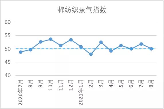 說明:中國棉紡織行業(yè)景氣指數(shù)采集自全國近500家次棉紡織企業(yè),參考國家制造業(yè)PMI等指數(shù)制定方式,通過對(duì)多個(gè)主要指標(biāo)加權(quán)計(jì)算得出,當(dāng)指數(shù)高于50,表示棉紡織行業(yè)本月景氣程度好于上月,低于50則表示本月景氣程度不及上月。