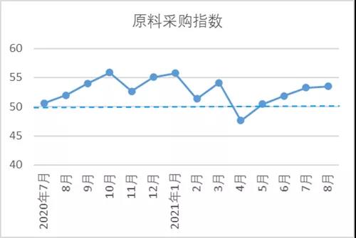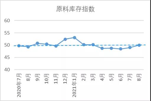8月,原料采購指數(shù)53.47,較7月上升0.22。從市場價(jià)格看,當(dāng)月國內(nèi)外棉價(jià)繼續(xù)保持上漲,國內(nèi)棉價(jià)漲幅依然高于國際棉價(jià)。CotlookA指數(shù)月平均值101.3美分/磅,環(huán)比上漲3.68%;3128級(jí)棉花月均價(jià)18128元/噸,環(huán)比上漲5.47%。非棉纖維方面,滌綸短纖價(jià)格小幅下跌,粘膠短纖價(jià)格上漲,漲幅不及棉花。8月,1.4D直紡滌綸短纖月均價(jià)7061元/噸,環(huán)比下跌1.16%;主流粘膠纖維月均價(jià)13151元/噸,環(huán)比上漲2.4%。8月23日,有關(guān)部門發(fā)出公告,儲(chǔ)備棉輪出交易僅限紡織用棉企業(yè)參與競買,停止非紡織用棉企業(yè)參與競買,棉紡織企業(yè)競拍儲(chǔ)備棉數(shù)量增加。因此,當(dāng)月棉紡織企業(yè)棉花采購量上升,非棉纖維采購量與7月基本持平。