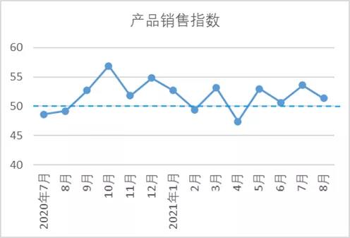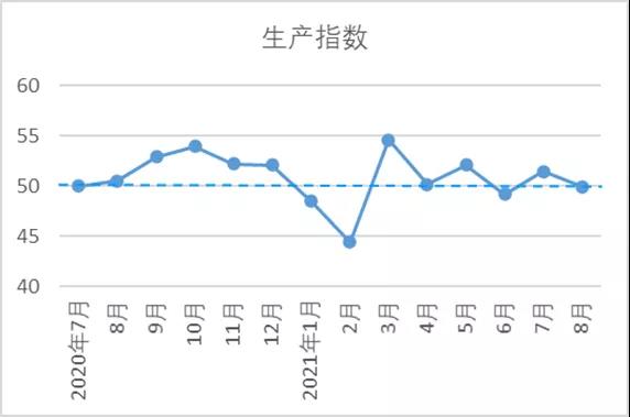 8月,生產(chǎn)指數(shù)49.94,較7月下降1.48。當(dāng)月,多數(shù)企業(yè)開機(jī)維持前期水平,部分企業(yè)出現(xiàn)空臺(tái)現(xiàn)象,疊加“雙控”影響,開機(jī)略有下調(diào)。其中,紡紗廠整體開機(jī)情況良好,紗產(chǎn)量環(huán)比增加;織布廠開機(jī)率下調(diào),布產(chǎn)量環(huán)比下降。調(diào)查數(shù)據(jù)顯示,當(dāng)月紗產(chǎn)量環(huán)比上升的企業(yè)占比為39.73%,高于下降企業(yè)占比12.52個(gè)百分點(diǎn),布產(chǎn)量環(huán)比下降的企業(yè)占比為38.16%,高于上升企業(yè)占比4.28個(gè)百分點(diǎn),開機(jī)率下降的企業(yè)占比為16.84%,高于上升企業(yè)占比6.56個(gè)百分點(diǎn)。