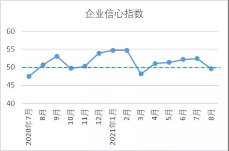 8月,企業(yè)信心指數(shù)49.59,較7月下降2.8。當(dāng)前,世界疫情仍在繼續(xù)發(fā)酵,全球制造業(yè)景氣度持續(xù)低于預(yù)期,資本市場避險(xiǎn)情緒加重,消費(fèi)信心下降。國內(nèi)方面,疫情多點(diǎn)散發(fā)和汛情等自然災(zāi)害對(duì)行業(yè)運(yùn)行有一定沖擊,“金九銀十”紡織旺季現(xiàn)象不明顯,上游原料價(jià)格的上漲未有效傳導(dǎo)至下游,市場預(yù)期減弱。為確保完成全年能耗“雙控”目標(biāo),多地積極推動(dòng)“雙控”政策,部分企業(yè)面臨限電停產(chǎn),信心較7月略顯不足。調(diào)查數(shù)據(jù)顯示,認(rèn)為后市樂觀向好的企業(yè)占比為24.83%,認(rèn)為后市弱勢下行的企業(yè)占比為28.91%。