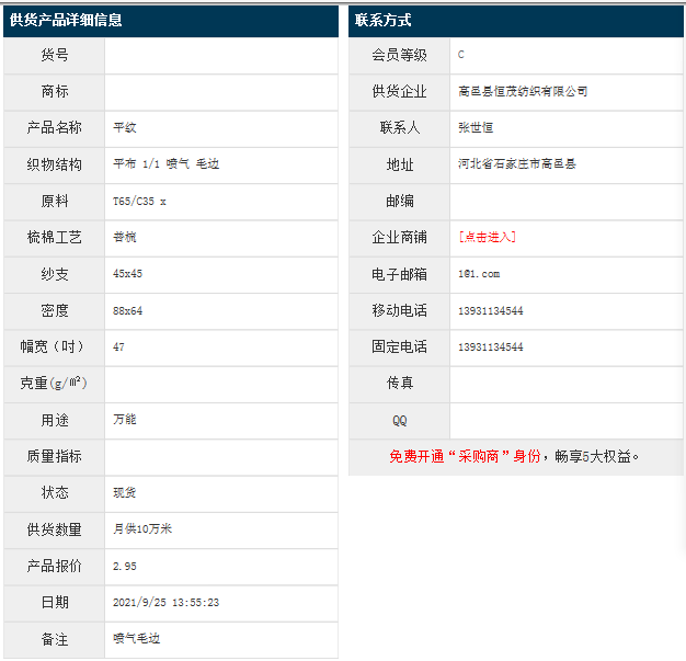 9月25日,高邑縣恒茂紡織有限公司滌棉平紋T65/C35 45x45 88x64 47" 1/1 噴氣 毛邊,報(bào)價(jià)為2.95元/米,實(shí)際成交價(jià)以協(xié)商為準(zhǔn)。[點(diǎn)擊查看詳情]