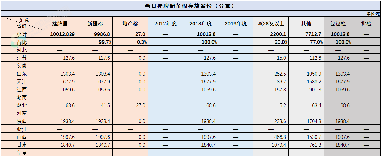 中國(guó)儲(chǔ)備棉管理有限公司定于9月27日通過(guò)全國(guó)棉花交易市場(chǎng)上市銷售中央儲(chǔ)備棉重量10013.839噸,共46捆,其中新疆棉9986.8噸。