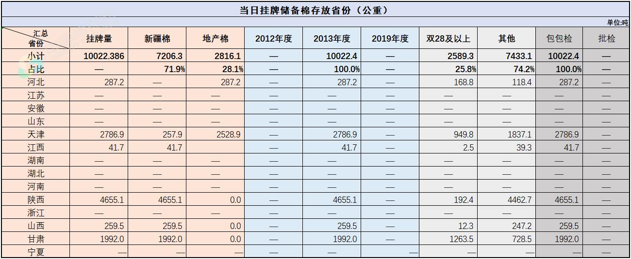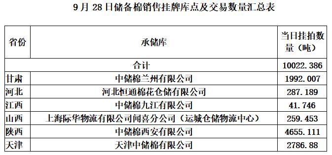 中國儲備棉管理有限公司定于9月28日通過全國棉花交易市場上市銷售中央儲備棉重量10022.386噸,共45捆,其中新疆棉7206.3噸。