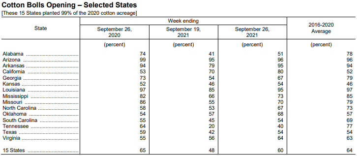 美國農(nóng)業(yè)部9月27日發(fā)布的美國棉花生長報告顯示,截至9月26日當(dāng)周,美棉吐絮率為60%,前周為48%,去年同期為65%,五年均值為64%。美棉收割率為11%,前周為9%,去年同期為13%,五年均值為14%。美棉生長優(yōu)良率為65%,前周為64%,去年同期為43%。