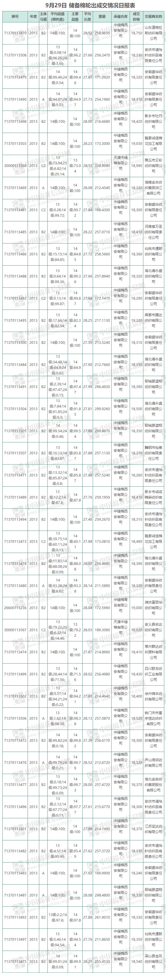 9月29日儲備棉輪出銷售資源10125.59噸,實際成交10125.59噸,成交率100%,成交均價18451元/噸,較28日上漲236元/噸,折3128價格20038元/噸,較28日上漲754元/噸。