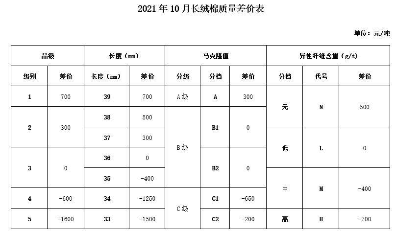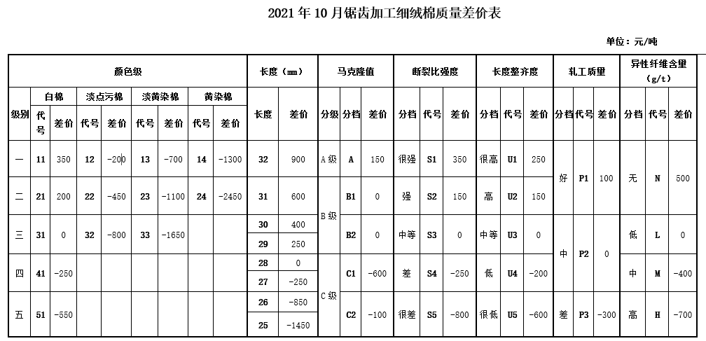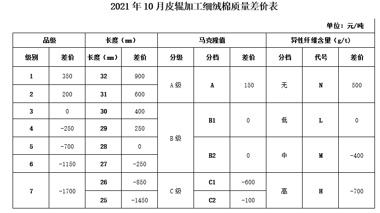 9月份國儲(chǔ)棉輪出的同時(shí),新花進(jìn)入采收和加工期,新疆棉花專業(yè)監(jiān)管倉庫于26日開放入庫預(yù)約,但公檢尚未開始,棉花質(zhì)量指標(biāo)數(shù)據(jù)尚未形成。依據(jù)2021年9月中國棉花協(xié)會(huì)棉花質(zhì)量價(jià)差自動(dòng)生成系統(tǒng)采集的棉花加工企業(yè)銷售成交價(jià)、紡織企業(yè)監(jiān)測點(diǎn)的采集數(shù)據(jù)以及當(dāng)月的中國棉花價(jià)格指數(shù),并征求業(yè)內(nèi)相關(guān)專家的意見,2021年10月鋸齒加工細(xì)絨棉質(zhì)量差價(jià)調(diào)整數(shù)據(jù)據(jù)此生成,現(xiàn)做出如下調(diào)整: