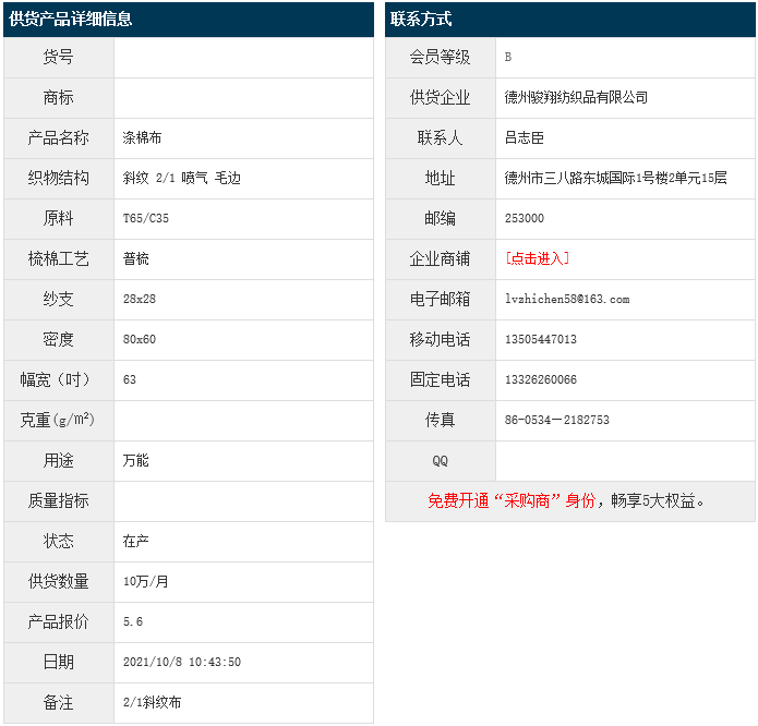 10月8日,德州駿翔紡織品有限公司滌棉斜紋布T65/C35 28x28 80x60 63" 2/1 噴氣 毛邊,報(bào)價(jià)為5.6元/米,實(shí)際成交價(jià)以協(xié)商為準(zhǔn)。[點(diǎn)擊查看詳情]